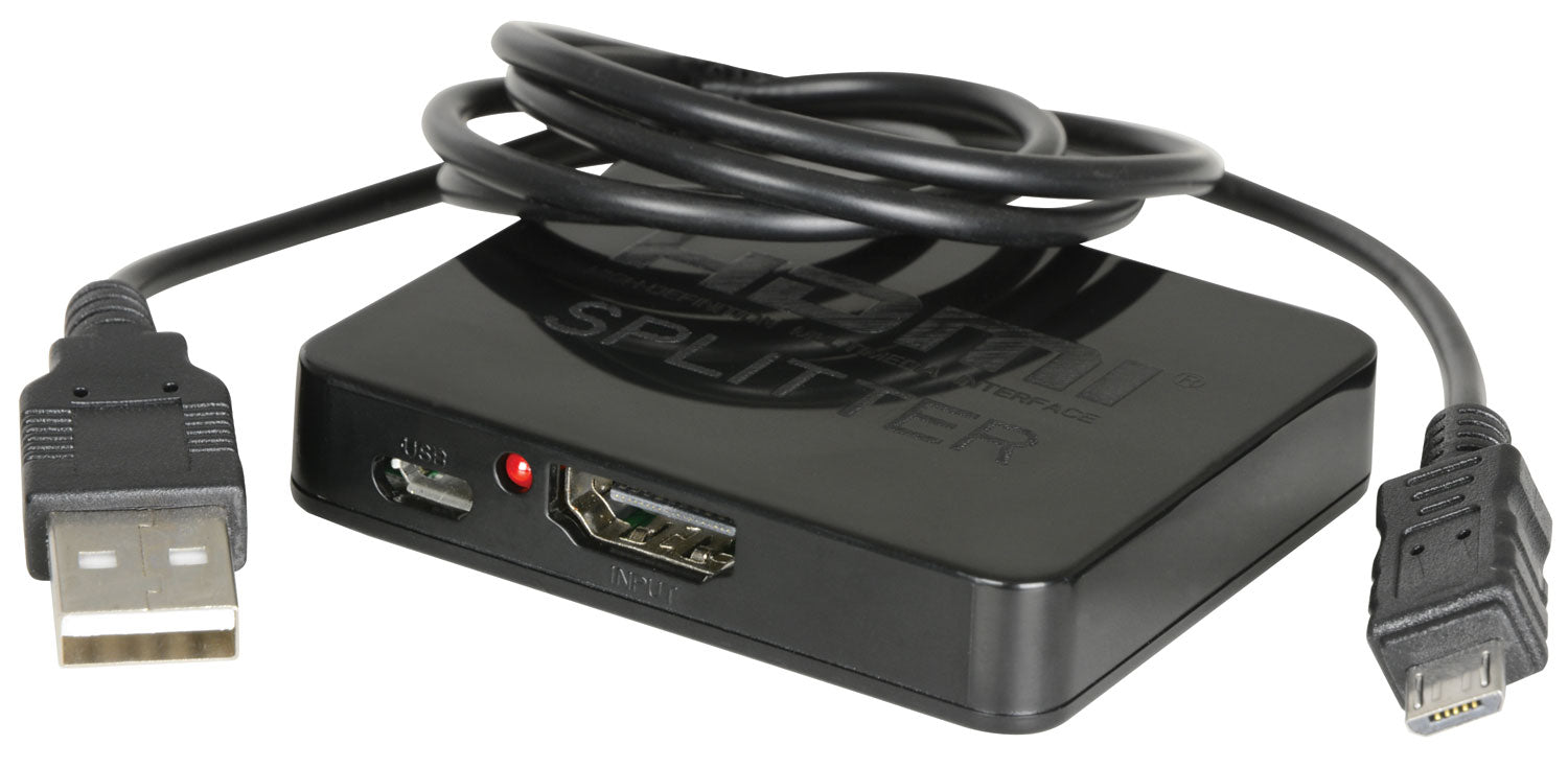 This 4K compatible mini HDMI splitter allows a single HDMI source to be connected to two displays simultaneously. It is supplied with an additional USB power lead if required, and can also be placed at the end of a long HDMI cable to regenerate the signal.