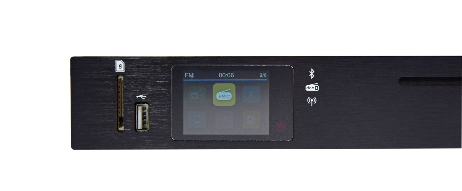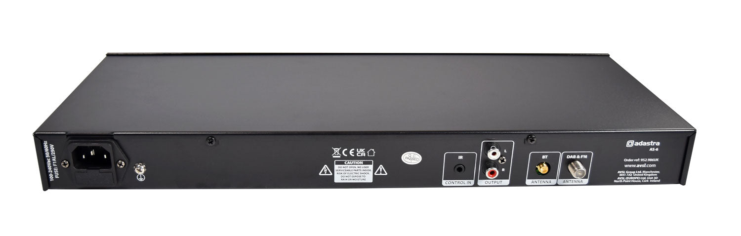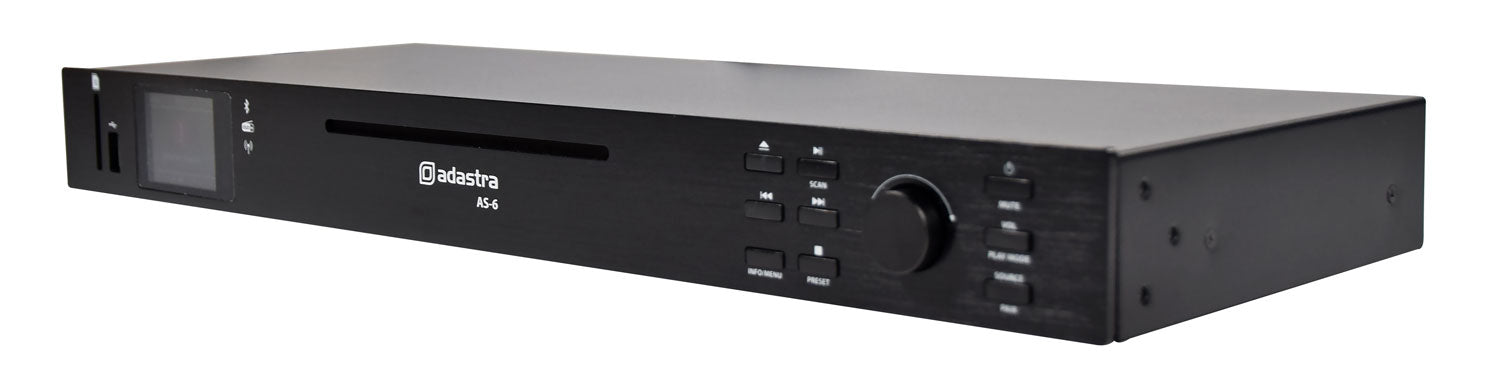 1U rack-mountable audio source with 6 different playback modes all in a single, compact unit. The clean and minimalist front panel is home to a full colour TFT display, which shows mode and settings information (including a clock in standby mode). Controls on the right side of the front panel operate the menus and playback, along with the included remote control handset. Modes include a slot-feed CD player, USB player, SD card player, FM tuner, DAB/DAB+ tuner and Bluetooth® receiver. A compact magnetic spring antenna is provided for FM and DAB+ reception which connects to an F socket on the AS-6 rear panel, or alternatively connect this socket to a roof mounted aerial for best possible reception. A comprehensive solution for playback in any sound system installation requiring background music and other continuous program material.