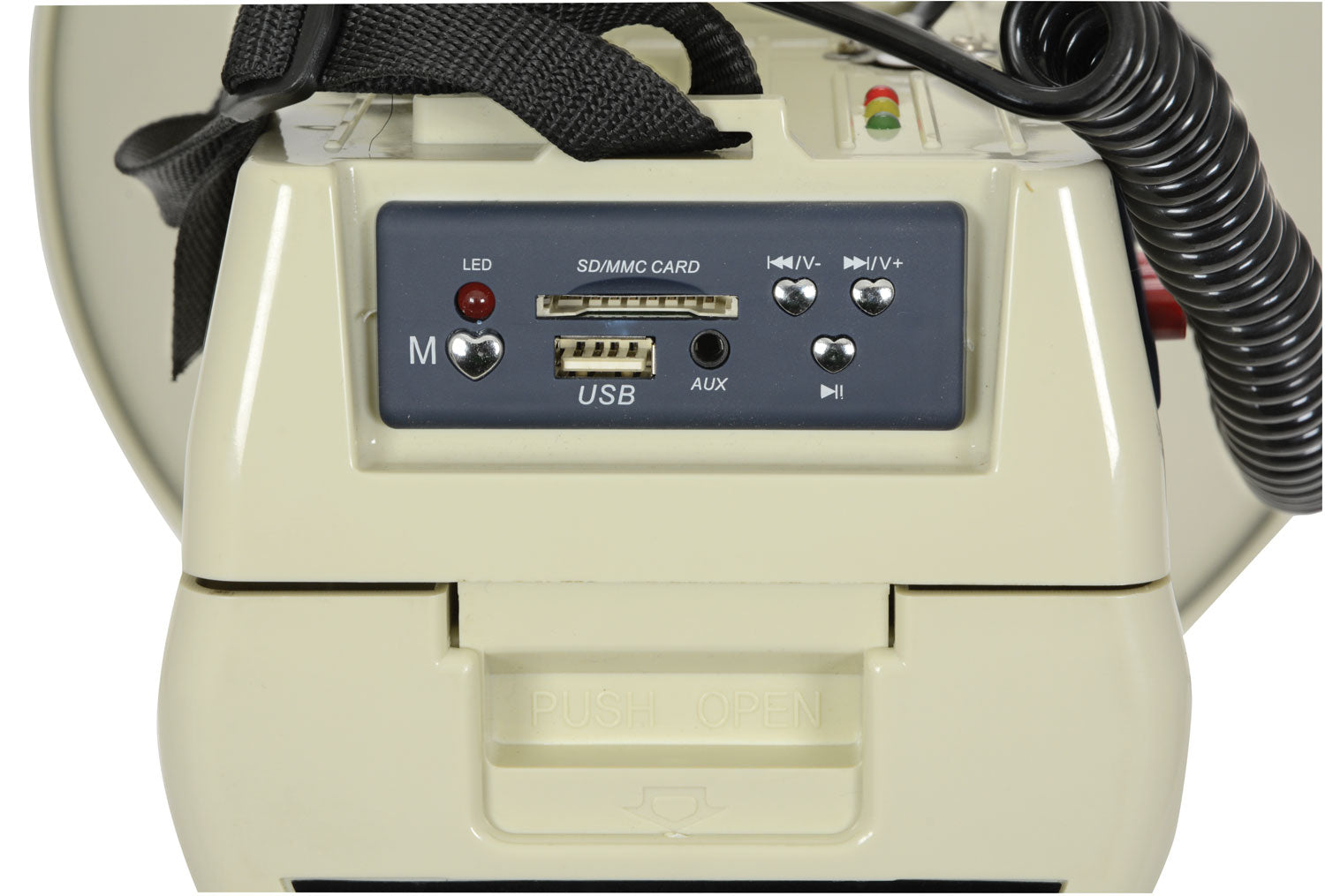 Can be operated free standing on rear legs or shoulder slung with the included strap. Alternatively, the megaphone can be mounted onto a stand via an 8mm threaded socket in the top of the flare. The rear panel is home to a USB/SD player with a 3.5mm aux input and a latched cover for the battery compartment. Three latching buttons control on/off, USB/SD, and siren buttons, while a non-latching button controls the whistle, all managed by a rotary volume control.