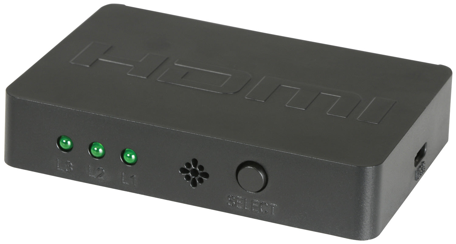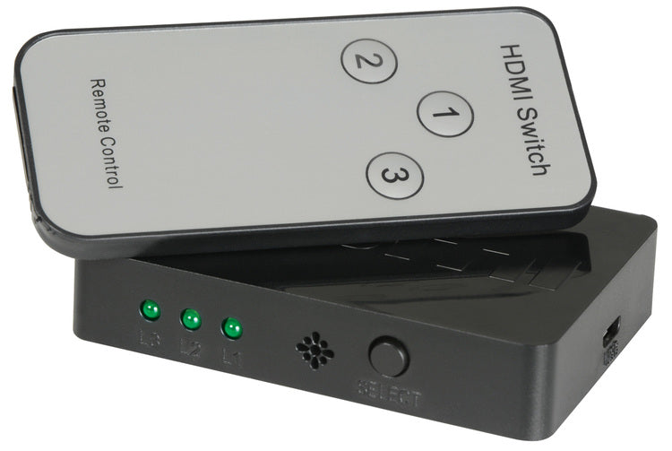 This mini HDMI switch allows a single display to be connected to up to 3 HDMI sources and selected using the IR remote control or selection button on the unit. Front LEDs keep you informed as to which of the inputs is live at any one time.