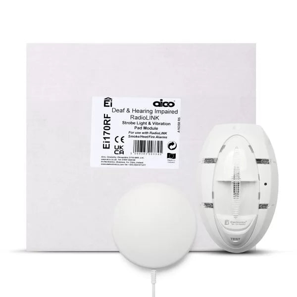 The Aico Ei170RF RadioLINK Alarm Kit for the Deaf & Hard of Hearing (SKU: Ei170RF) is a specialised fire and CO alerting system designed to protect individuals with hearing loss by providing visual and tactile warning signalswhen an alarm is triggered. Featuring a high-intensity Xenon strobe light and a powerful vibrating pillow pad, this wireless kit offers vital peace of mind, especially while sleeping or during quiet times when audible alarms may go unnoticed.