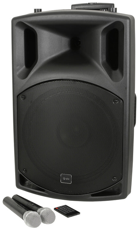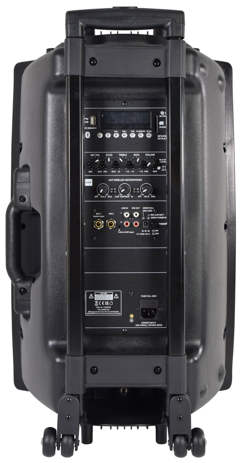 QTX: 178.857UK, Portable PA System, 15 Inch, UHF, Bluetooth, 2 Wireless Mics, 50W RMS