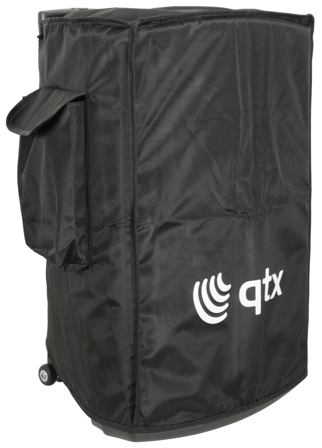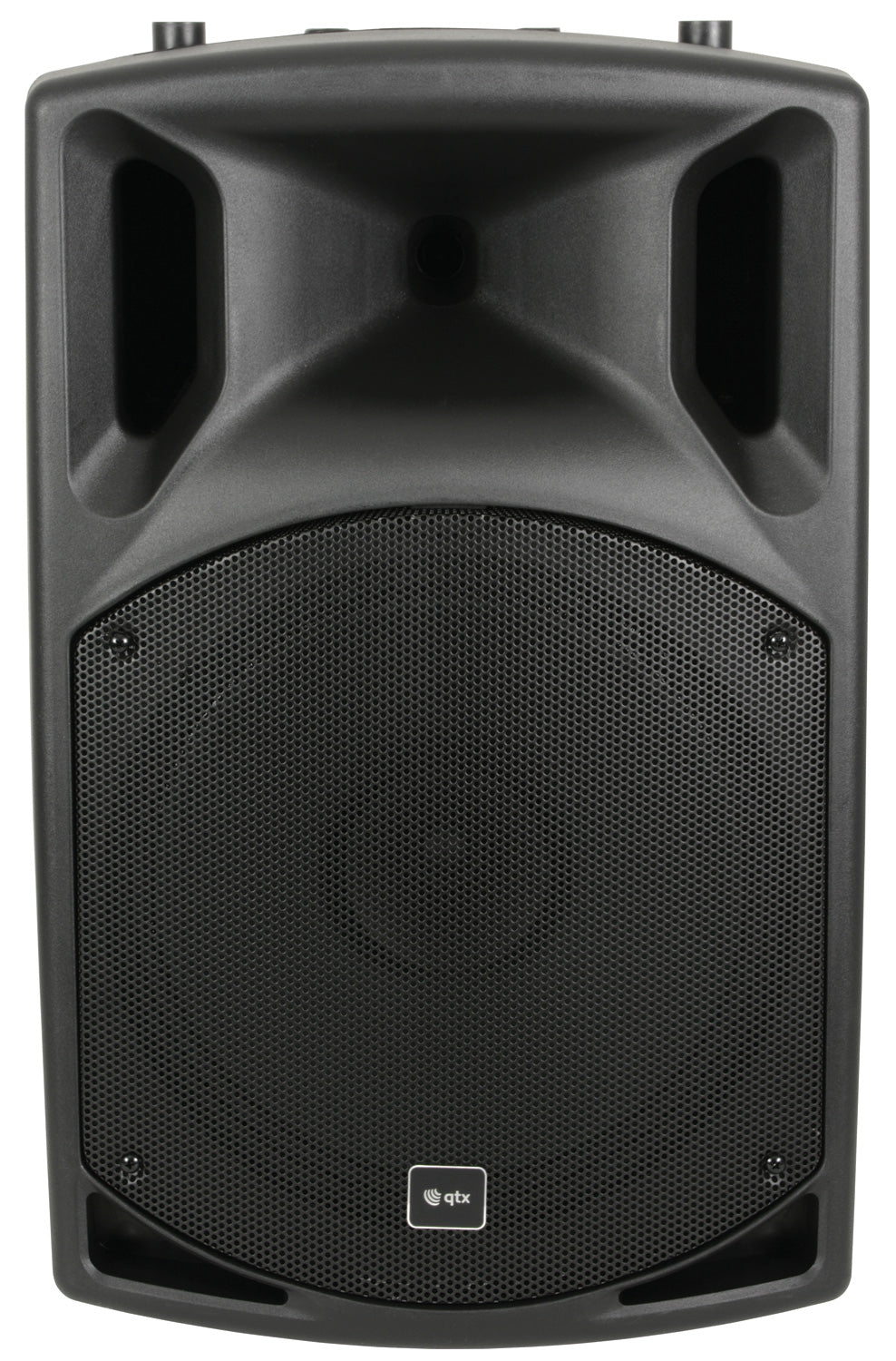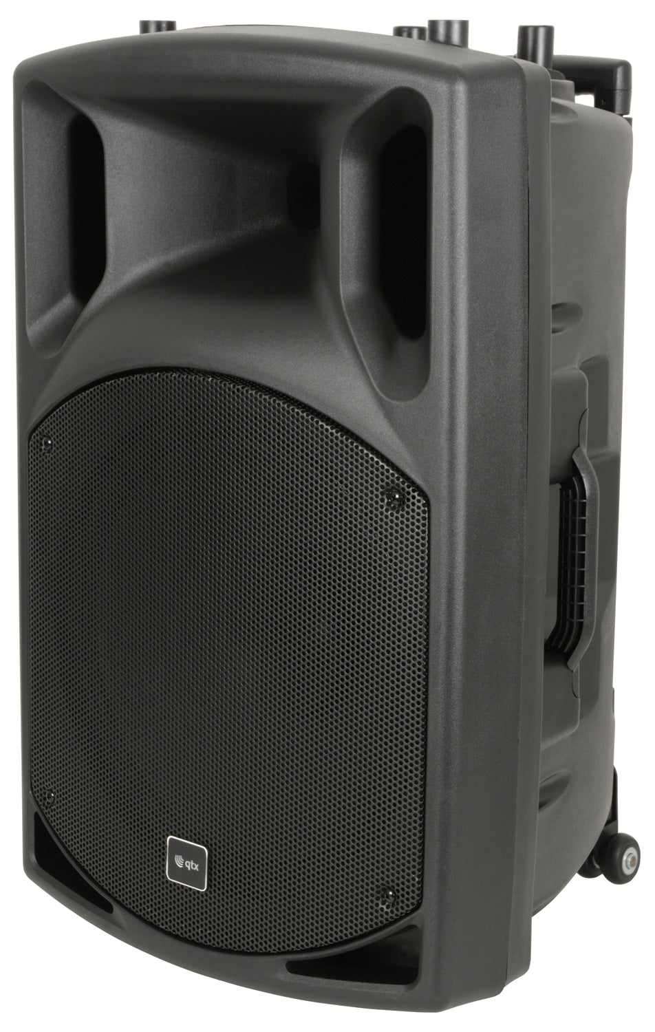 Complete portable PA unit in a QX-series cabinet. Built-in amplifier operating from mains or internal rechargeable battery powering a main driver and compression driven horn unit. 2 x UHF handheld wireless microphones are included with the receiver built into the rear panel along with 2 further mic inputs, auxiliary line input and Bluetooth receiver. Internal audio source is provided by an integral USB/SD/FM media player. A moulded handle and 35mm pole mount are built into the cabinet and a retractable trolley handle and rear wheels provide easy portability.