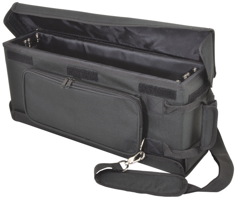 Shallow 19" rack case in a padded bag with front and rear flaps for access and ventilation. Equipment is protected by an inner wooden frame and secured by metal rack strip front and rear. Also fitted with carrying handle, shoulder strap and zipped outer pocket.