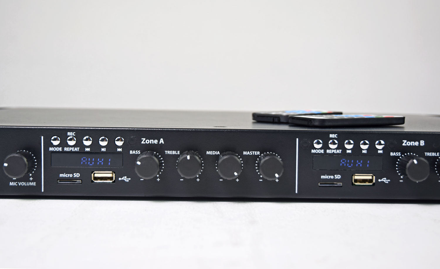 Each zone features its own audio player module, with an array of inputs including USB, microSD, FM, Bluetooth, and stereo line inputs. The unit is designed for 19" rack mounting, providing a clean and efficient set-up for audio visual needs.