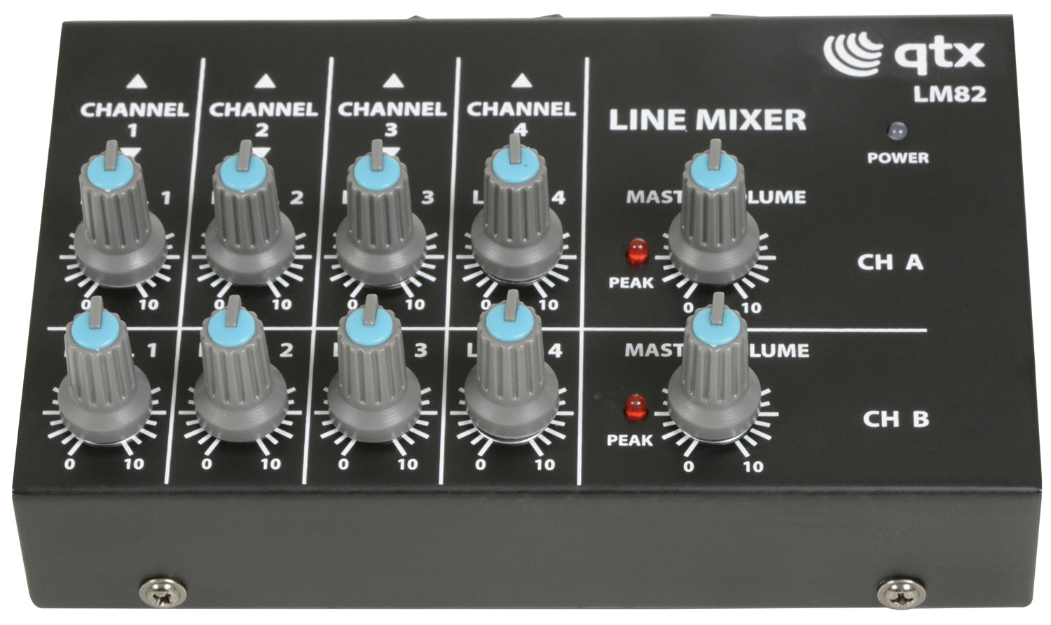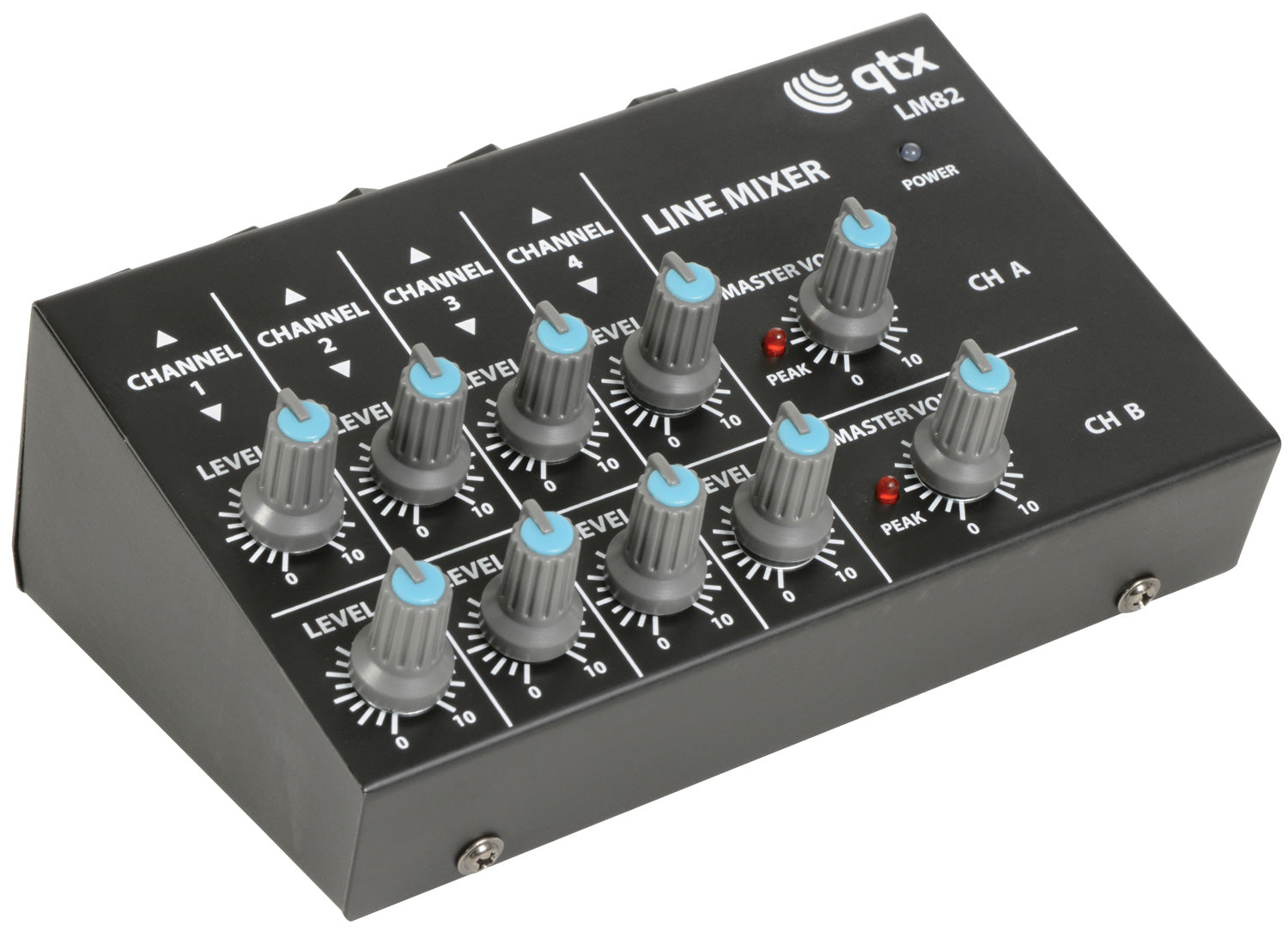 QTX: 170.205UK, Mini Line Level Mixer, 4 Stereo Jack Inputs, 2 Outputs, Compact Design, Battery or Adaptor Powered