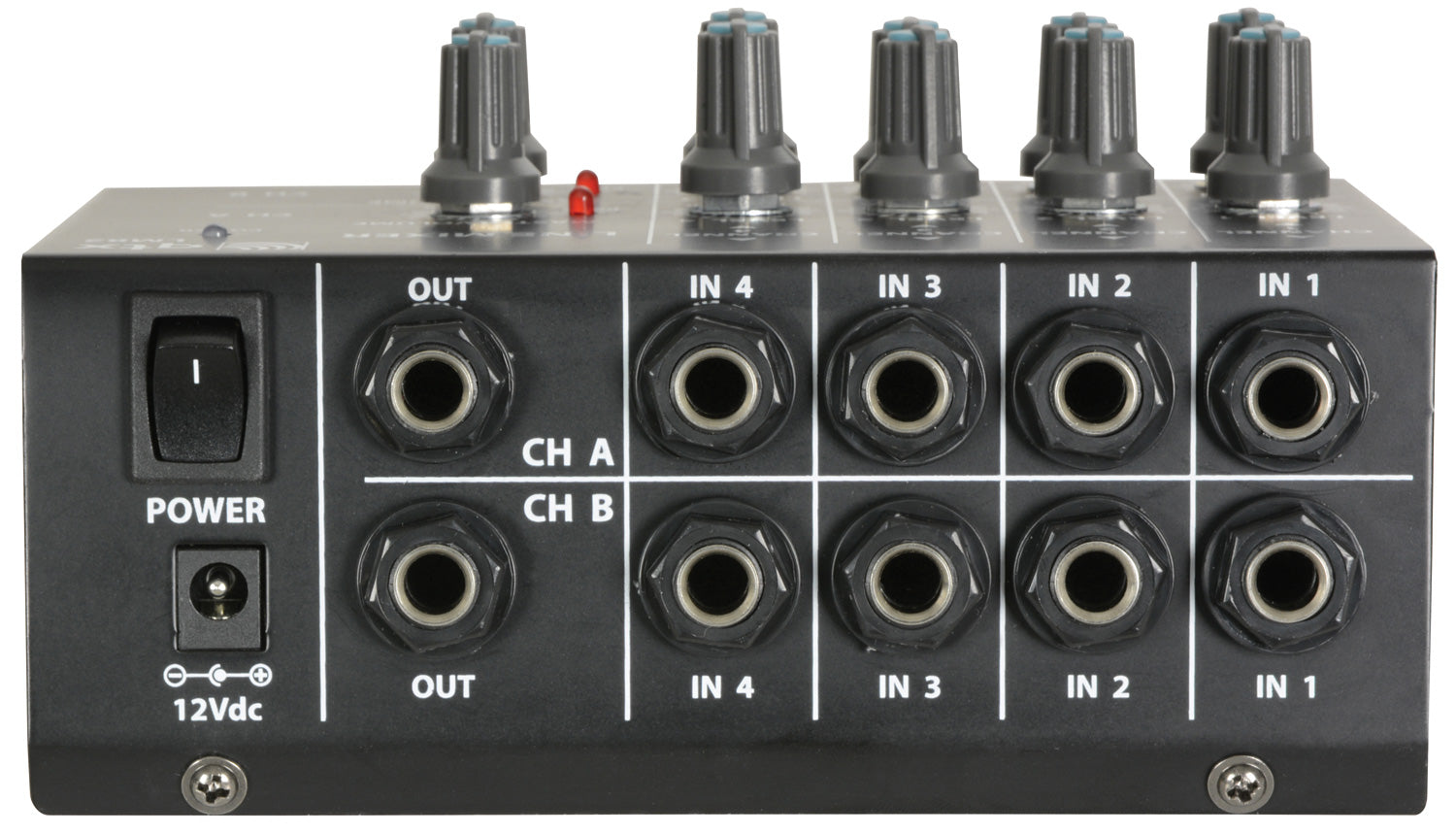 Compact mixers with high impedance jack inputs suitable for auxiliary line level or instruments, mixing to a master jack output. Available as either 4 mono or 4 stereo version with separate volume controls for each input and master output. Powered by 1 x 9V battery or optional 12Vdc adaptor.