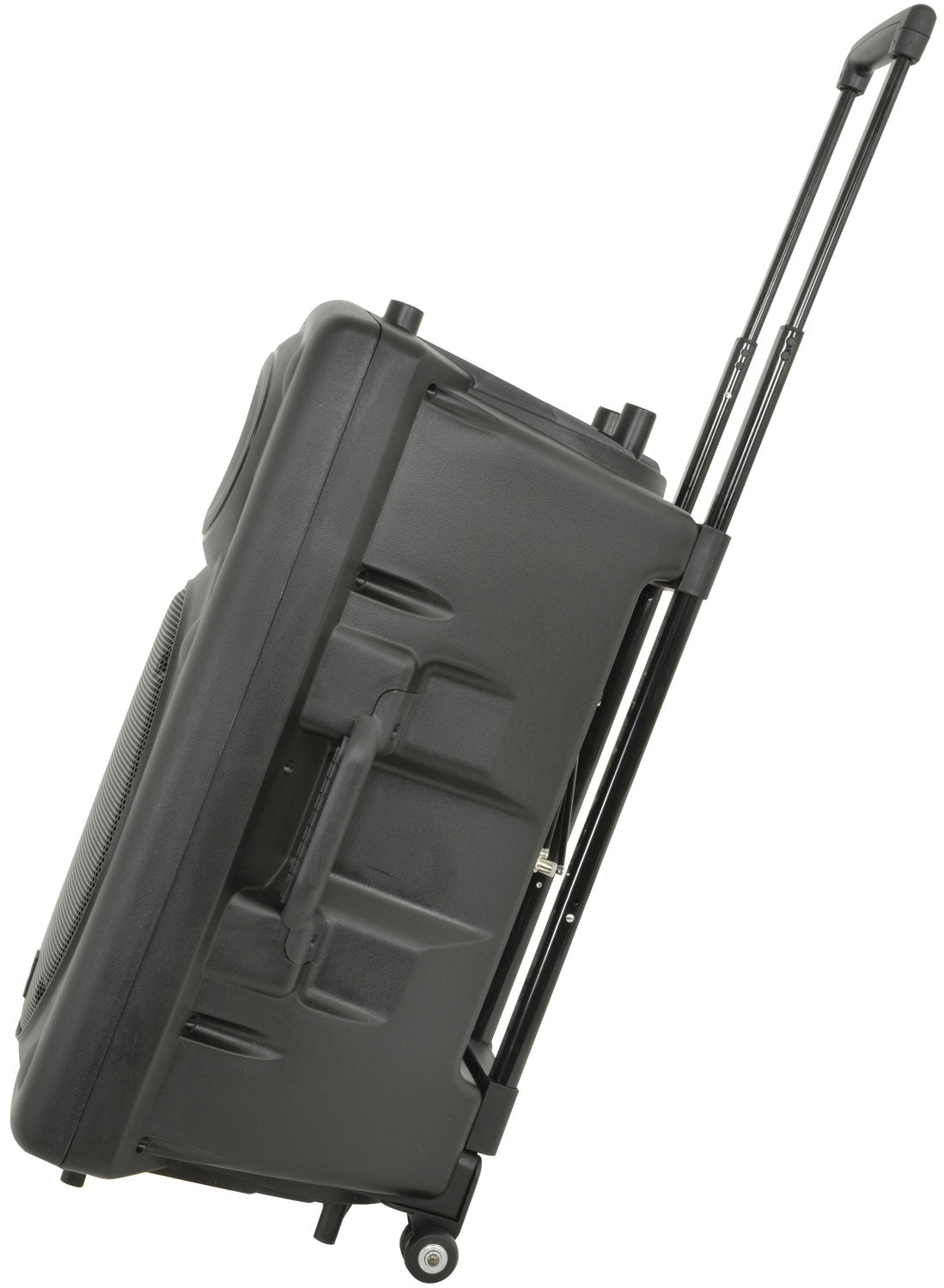 Introducing the QR Series Portable Powered PA Unit, a highly versatile solution designed for easy transport and powerful sound delivery. This compact, trolley-style PA unit boasts a top-mounted retractable handle and side carry handles, making it ideal for mobile use.