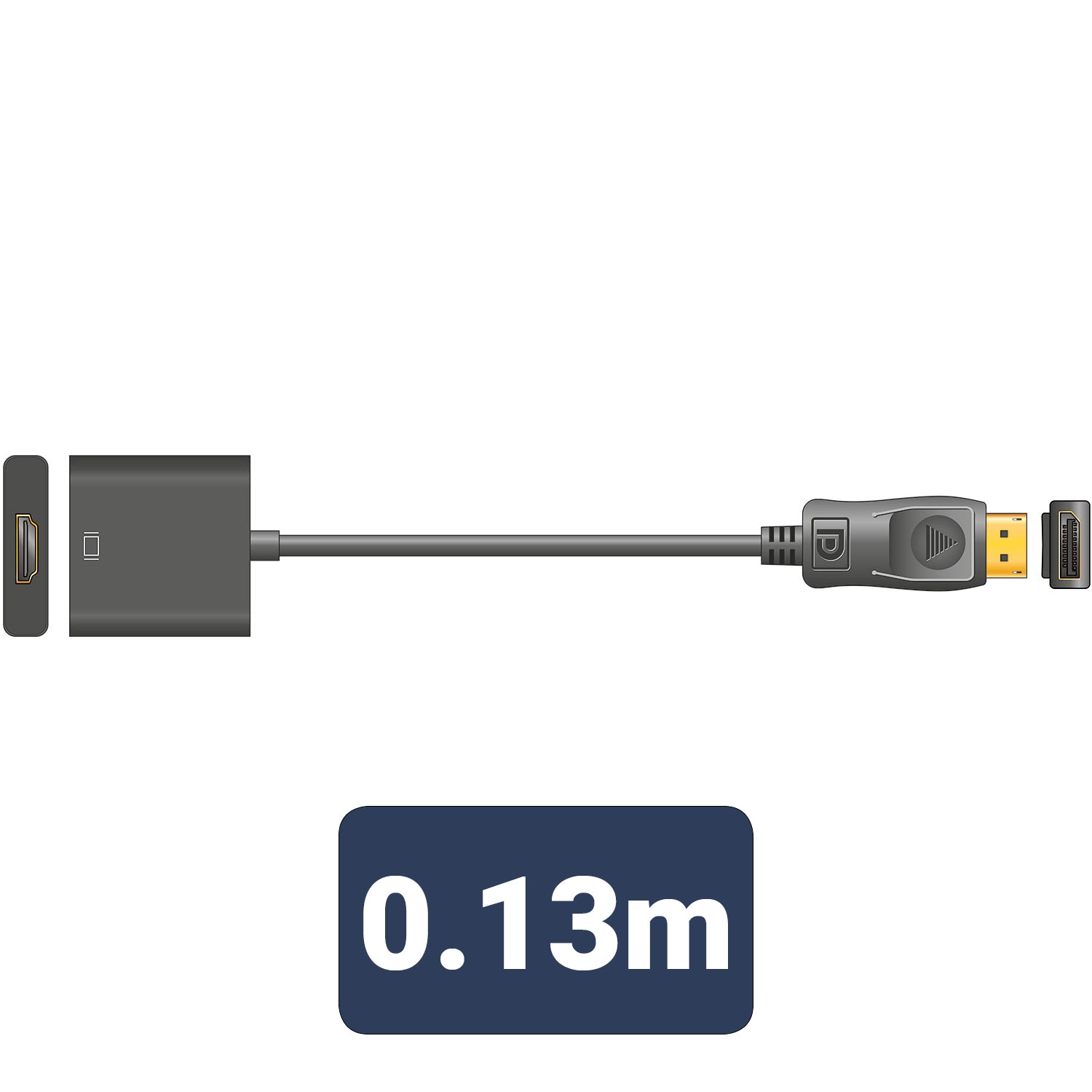An adaptor lead converting a DisplayPort plug to an HDMI socket. Ideal for sending digital audio and video signals up to 4K (3840x2160) from PCs and laptops to HDMI-compatible TVs and monitors (additional HDMI cable required).