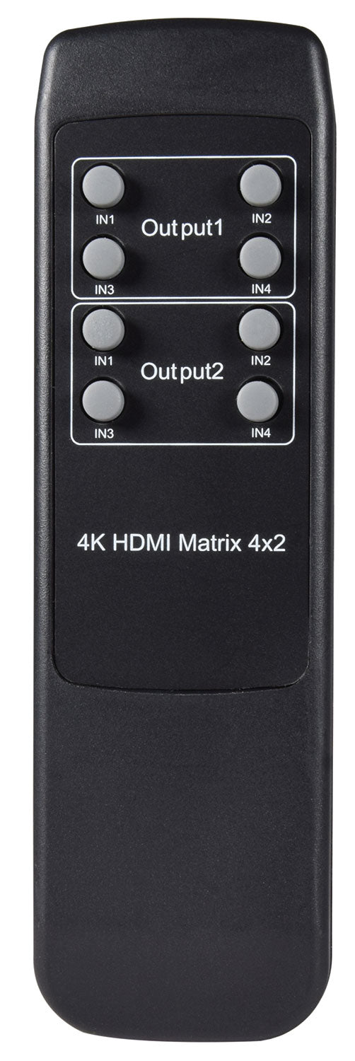 A 4K HDMI matrix to switch between 4 source devices and 2 display outputs. Use with HDMI cables of a combined 30m per input/output for 4K@30Hz and FHD resolutions, or a combined 10m per input/output for 4K@60Hz. SPDIF and 3.5mm stereo outputs allow the audio signal for each source device to be simultaneously channelled through a separate sound system and/or headphones. Compatible with the latest 4K digital TV boxes making it ideal for hospitality and entertainment venues. Supplied with IR remote to switch between sources for both outputs.