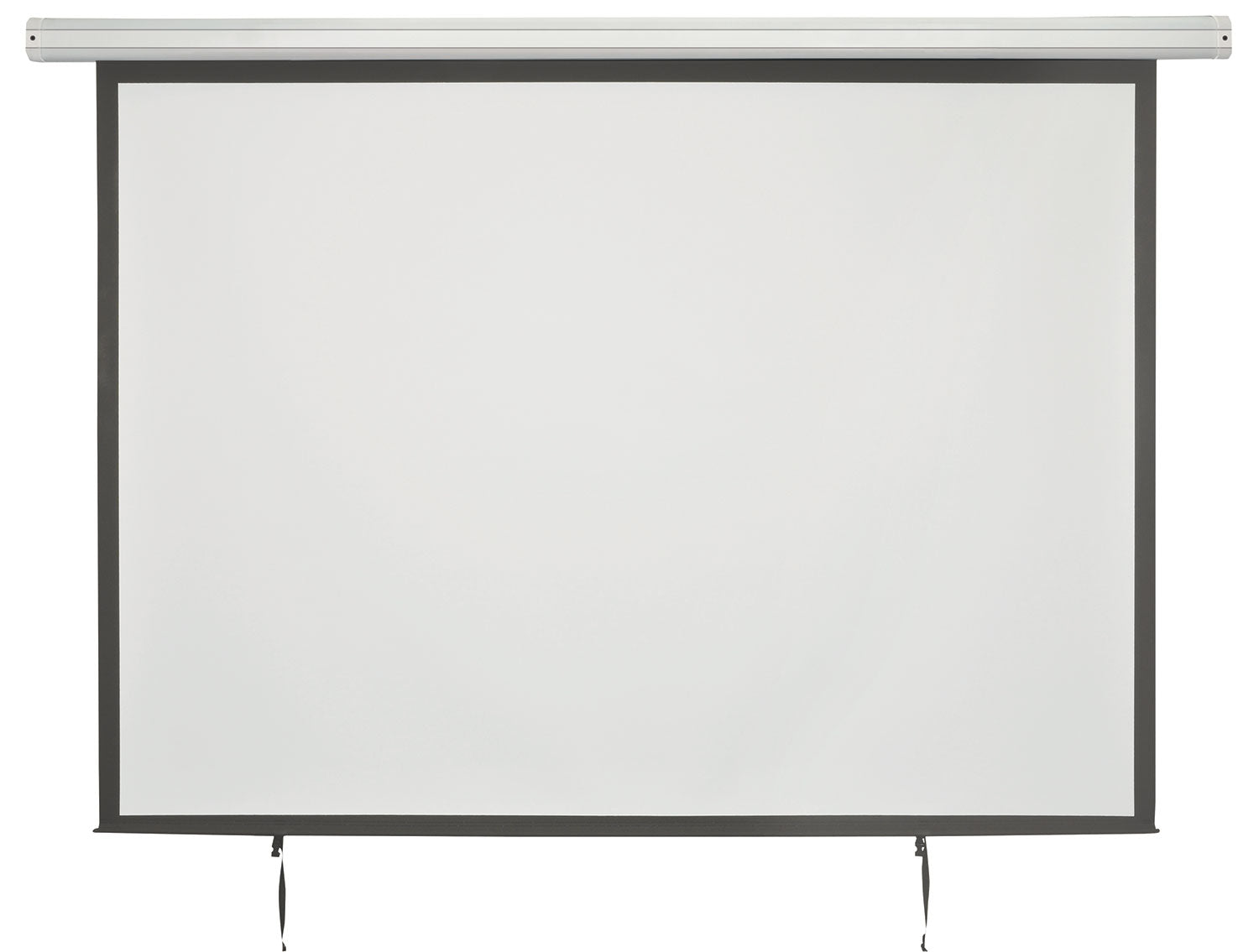 A range of large format projector screens with built-in electric motor controlled via the in-line switch or remote control. The screen is housed in a white steel case with mounting brackets on either end, allowing installation onto ceilings or walls. The screen itself features a weighted bottom bar to prevent jamming in the case or curling. Various sizes available for all types of installation such as classrooms, auditoriums or places of worship.
