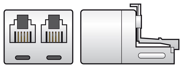A splitter connecting 2 x RJ11 sockets to an RJ11 plug. Ideal for telephone and data connections.