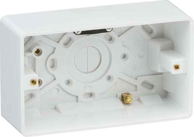 The Knightsbridge Double 47mm Pattress Box is designed for reliable installation within the Knightsbridge Curved Edge (CU) series of wiring accessories.