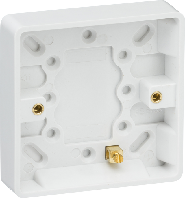 Knightsbridge: CU1300, Single 16mm Pattress Box with Earth Terminal, IP20, Thermoset Resin, White