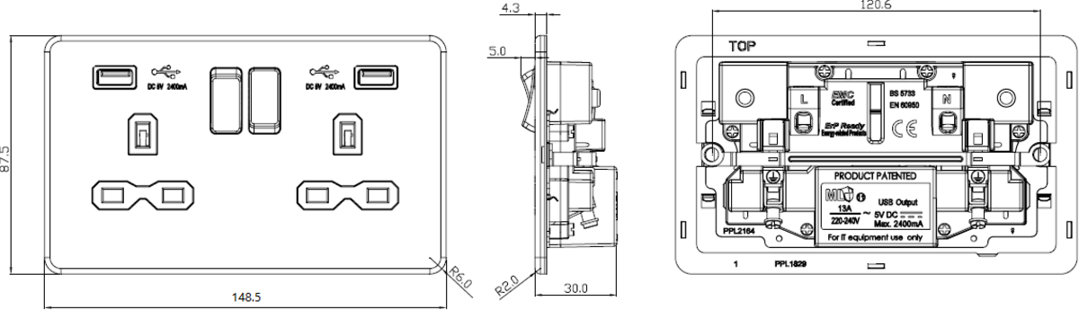 • Certified to BS1363-2:2016, EN 62368-1, EN 62680-1-1, EMC and ErP Certified