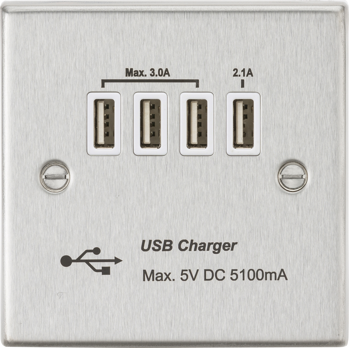 230V Quad USB Charger Outlet in Brushed Chrome with White Insert.