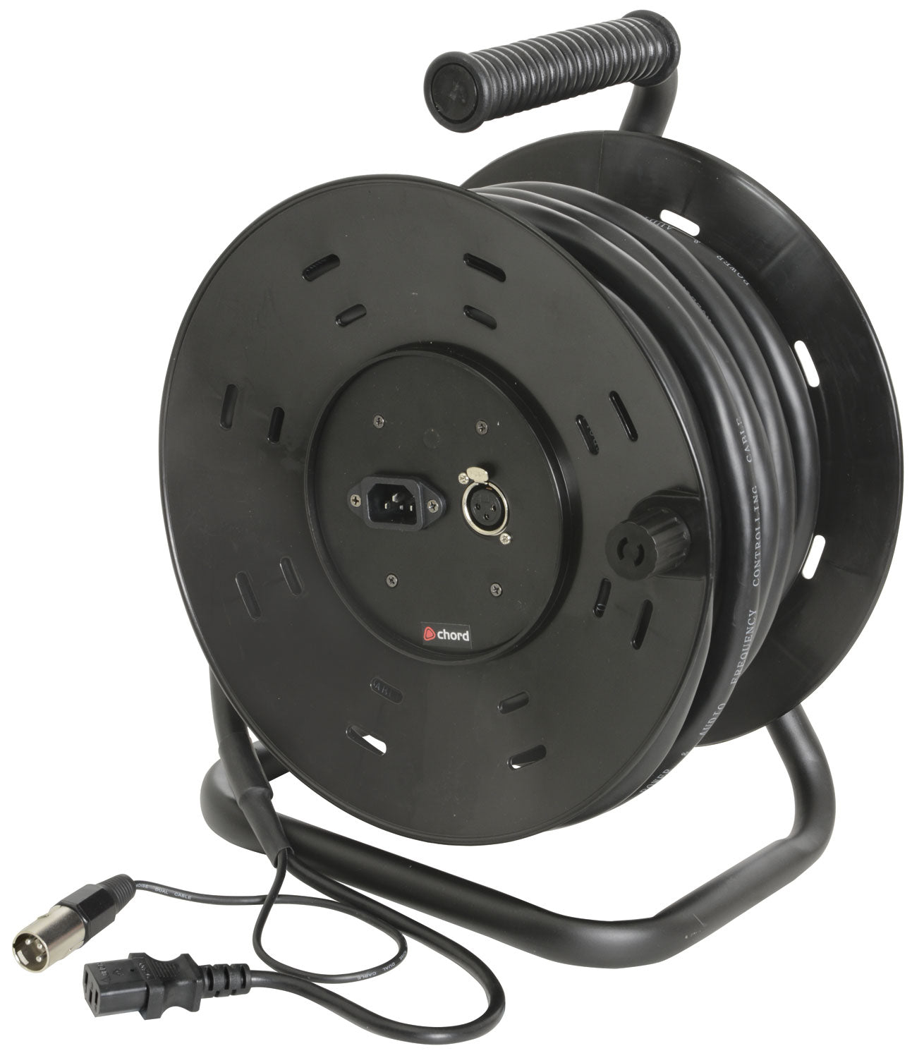 A sturdy reel loaded with an IEC power lead (M/F sockets) and an XLR lead (M/F) so power and audio can be laid out simultaneously. Ideal for use with active speakers.