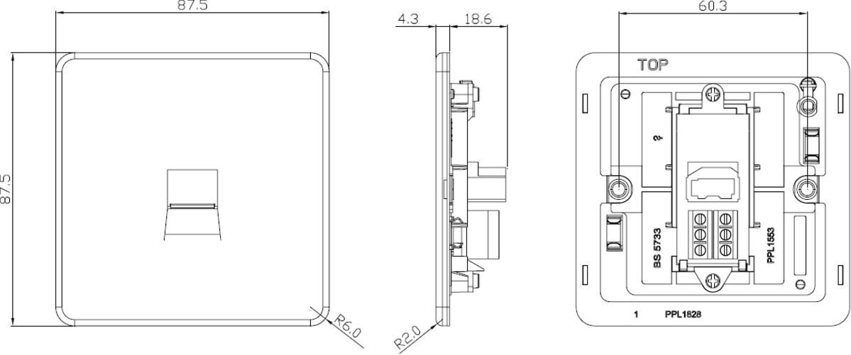 • Dimensions:Width: 87.5 mm, Height: 87.5 mm, Depth: 22.9 mm, Projection: 4.3 mm, Plate Depth: 4.3 mm, Recessed Depth: 18.6 mm
