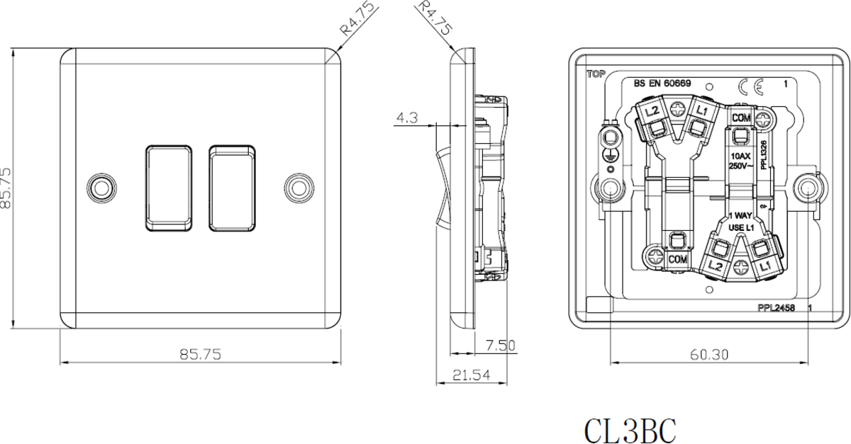 Knightsbridge: CL3BC, Brushed Chrome 10AX 2G 2-Way Switch, Rounded Edge, Screw Terminal, IP20, 304 Stainless Steel