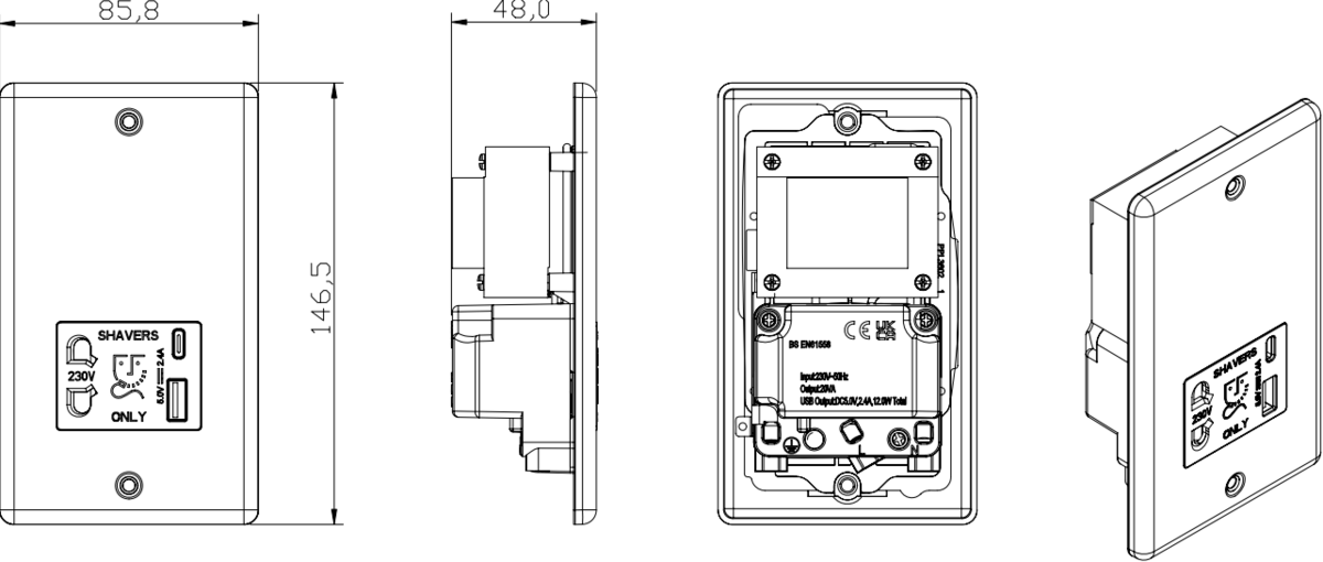 The 230V Shaver Socket with Dual USB A+C provides a modern and functional addition to any bathroom.