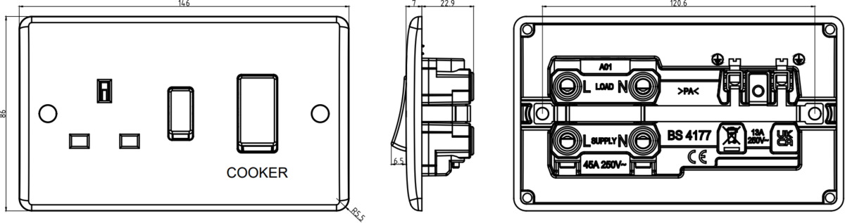 Knightsbridge: CU8333, 45A DP Cooker Switch & 13A Socket, White, IP20, 230V, 7mm Profile