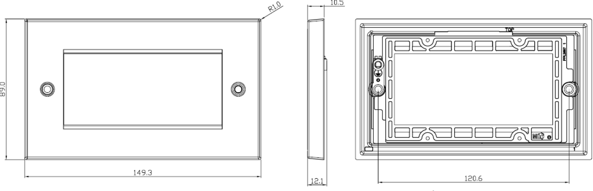 • Dimensions:Depth: 12.1 mmWidth: 149.3 mmHeight: 89 mmProjection: 10.5 mmPlate Depth: 10.5 mm