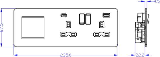 • Dimensions:Width: 235 mm, Height: 87.5 mm, Depth: 31.7 mm, Projection: 9.5 mm