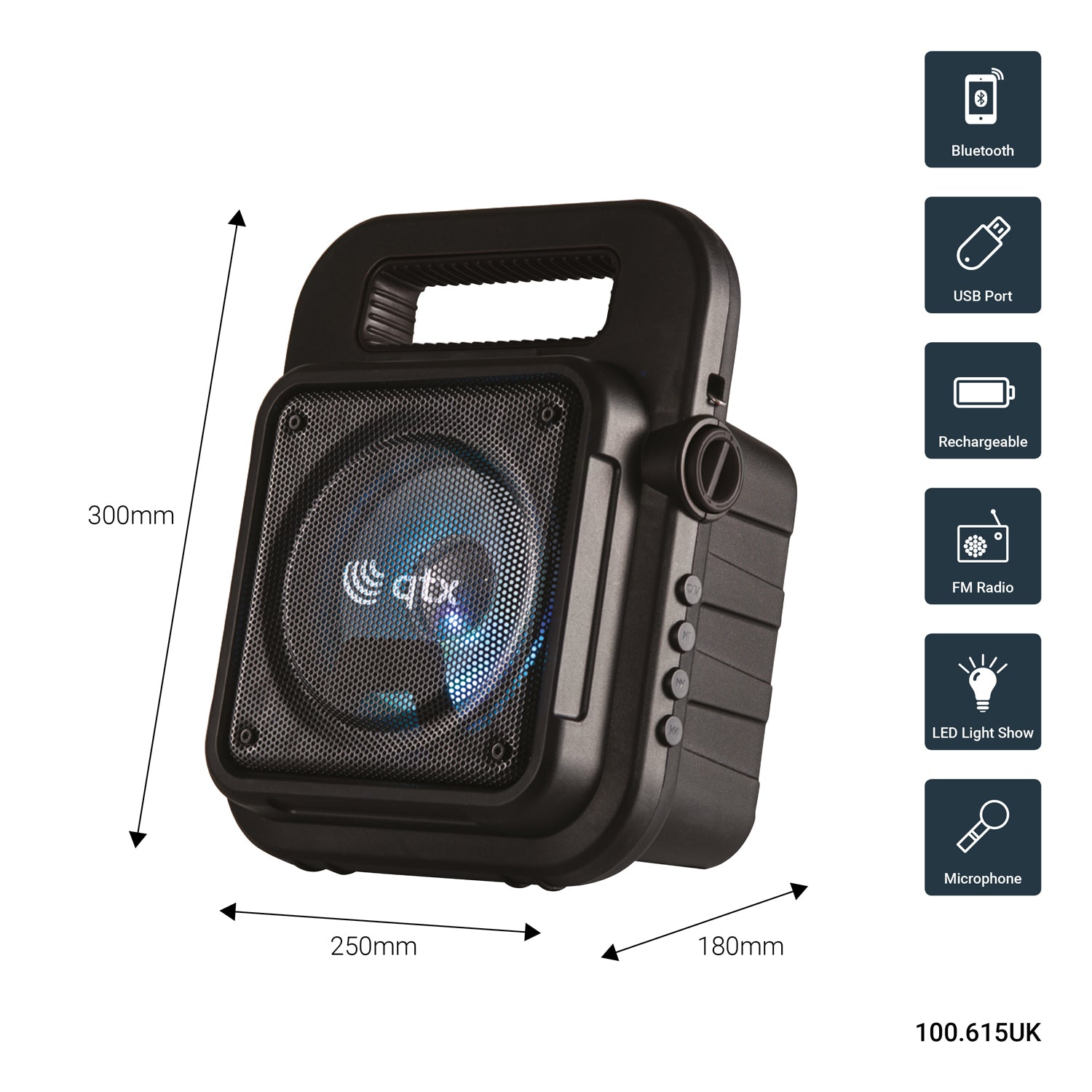 QTX: 100.615UK, Portable Bluetooth Party Speaker, 10W RMS, 3 Hour Battery, LED Light Show
