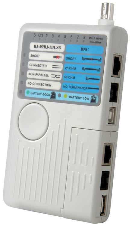 - Tests all common network types: RJ45 (UTP/STP), RJ11, USB and BNC