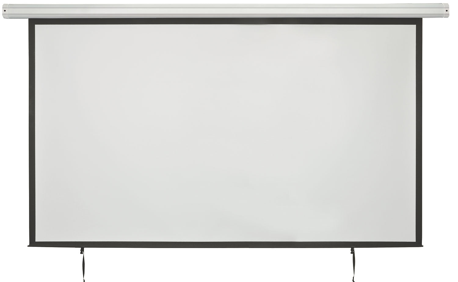 A range of large format projector screens with a built-in electric motor controlled via the in-line switch or remote control. The screen is housed in a white steel case with mounting brackets on either end, allowing installation onto ceilings or walls. The screen itself has a weighted bottom bar to prevent the screen jamming in the case or curling. Various sizes are available for all types of installation such as classrooms, auditoriums or places of worship.