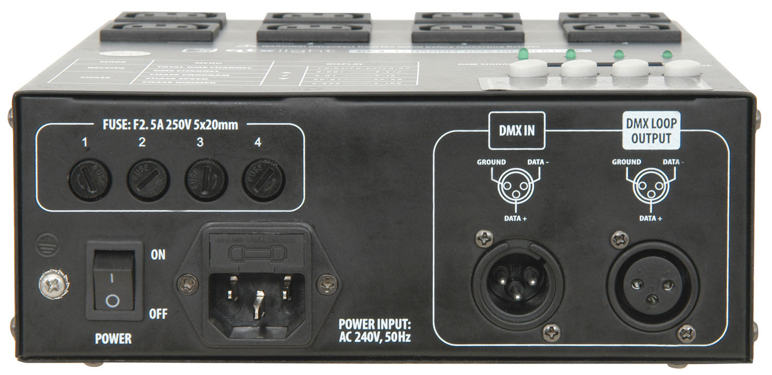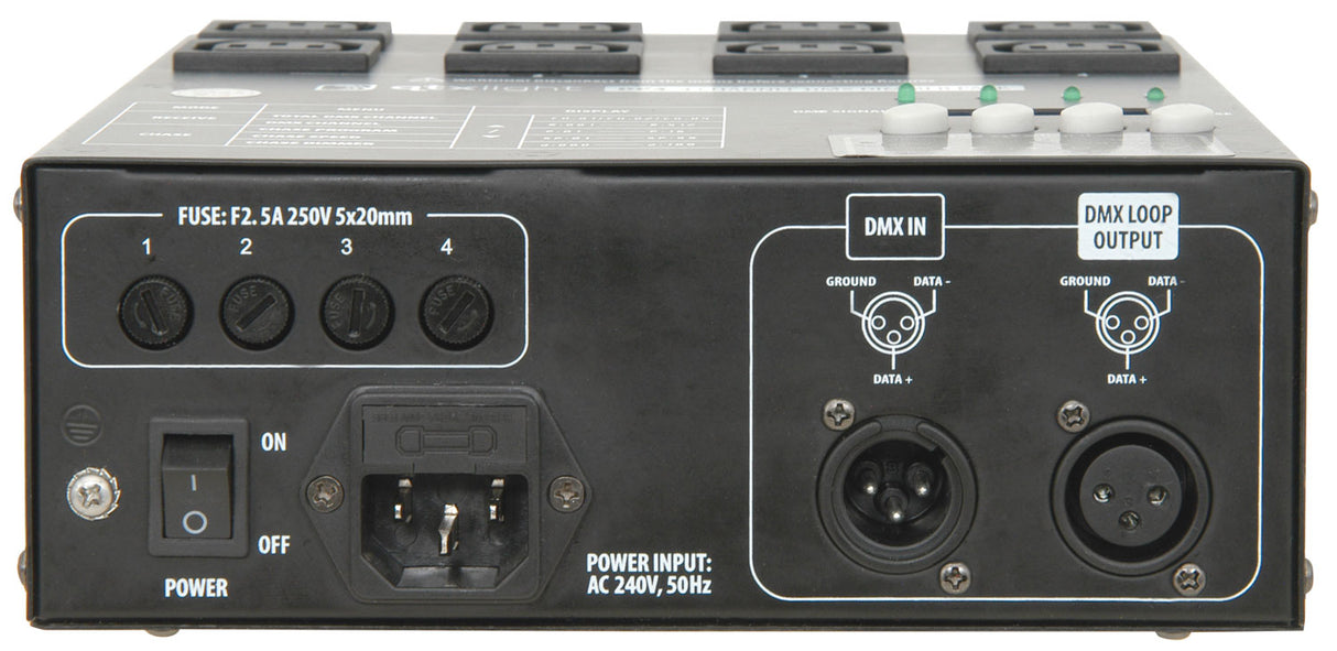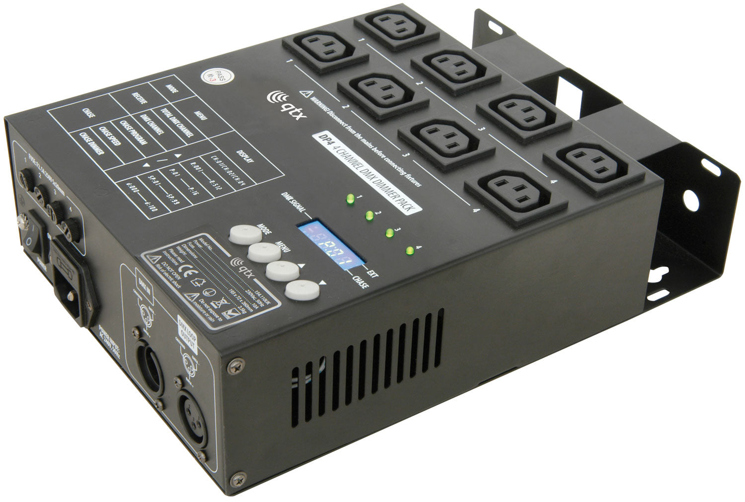The DP4 4 channel DMX dimmer pack is a versatile solution for stage lighting control. This compact yet powerful unit features: