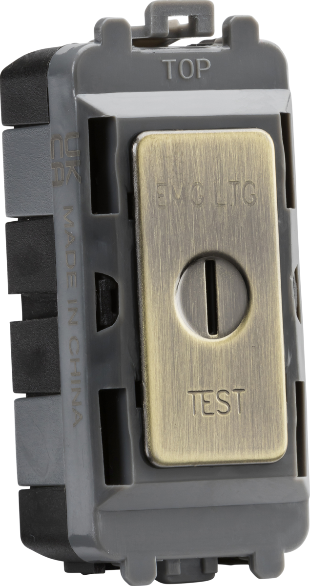 Knightsbridge: GDM008AB, 20AX DP Key Switch Module, Marked EMG LTG TEST, Antique Brass Finish, 2 Way, 230V, 19.8mm Depth