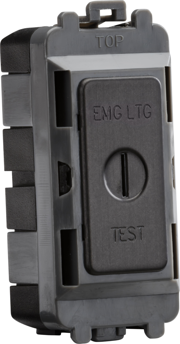 The Knightsbridge 20AX DP Key Module, marked EMG LTG TEST, features a sleek smoked bronze finish and is designed for ease of installation. The module simply clips into position from the front of the mounting frames (sold separately).