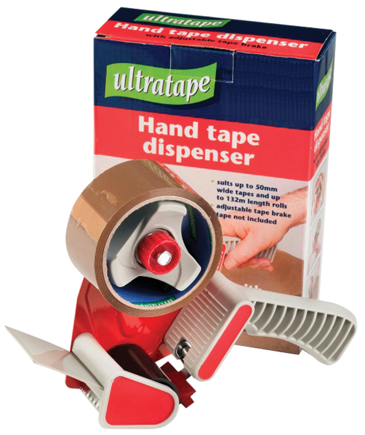 Ultratape simple and easy hand tape dispenser for parcel tape. Suits up to 50mm wide tapes, up to 132m length rolls with adjustable tape brake.