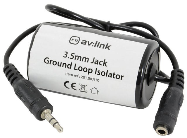 AV:Link: 201.087UK, Ground Loop Isolator, 3.5mm Jack Input/Output, Eliminates Hum, 0.13kg, 600mm Cable