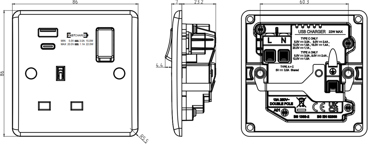 The 13A 1G DP Switched Socket with Dual USB A+C is equipped with a gently contoured 7mm plate, promoting aesthetic appeal and functionality.