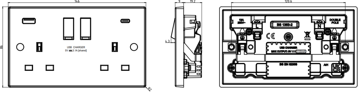13A 2G DP Switched Socket with Dual USB A+C features