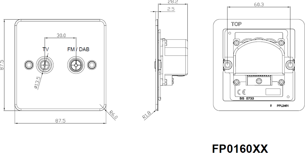 Knightsbridge: FP0160PC, Screened Diplex Outlet, TV & FM/DAB, Polished Chrome, Ultra Low Profile, BS 5733, 87.5mm