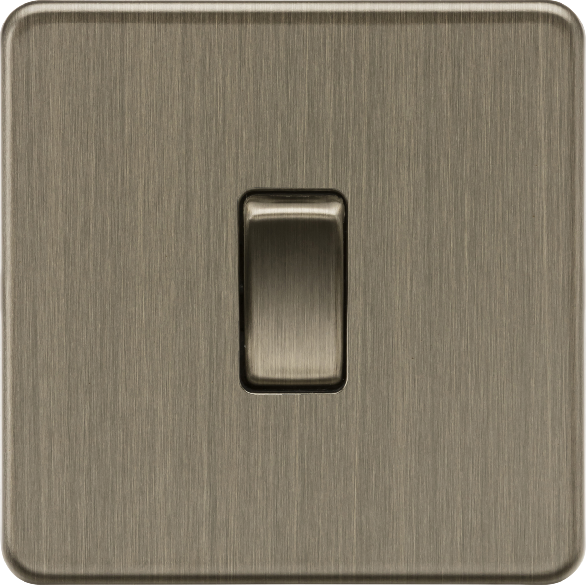 Enhance your modern home with this 10AX 1 Gang Double Pole Switch in a stunning Antique Brass finish. Designed for optimal functionality and aesthetics, it features a screwless low profile design with a matching metal rocker.