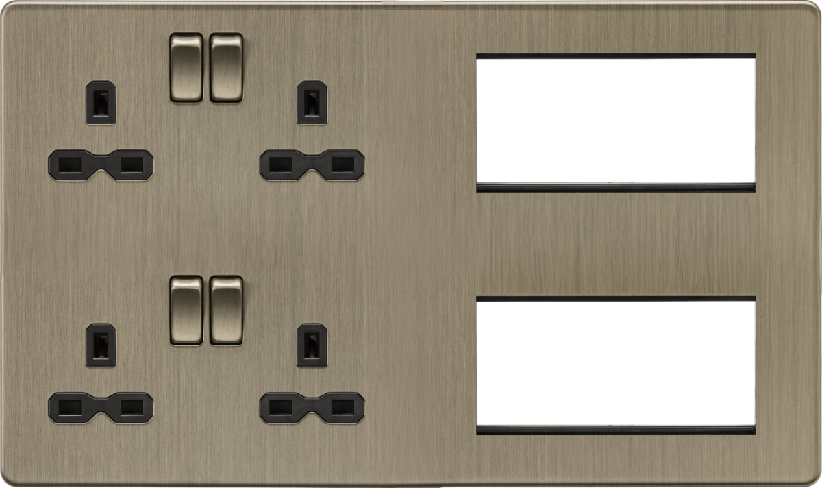 Knightsbridge: SFR298AB, Multimedia Combination Plate, 2 x 2G Double Sockets, Screwless Design, Antique Brass Finish, 230V, Modular Insert Capacity 8
