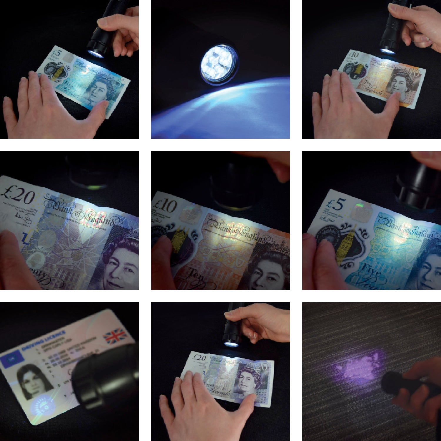 The 9 LED UV Torch is a compact and durable device designed for effective bank note checking and verifying security features.