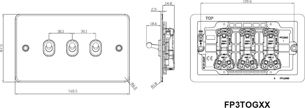 • Width: 147.5 mmHeight: 87.5 mmProjection: 2.5 mmMinimum Mounting Box Depth: 16 mm