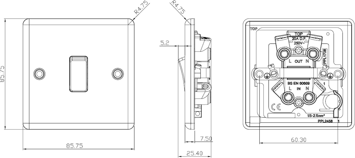Knightsbridge: CL834PC, 20A Double Pole Switch, Rounded Edge Design, Polished Chrome, 230V, 304 Stainless Steel