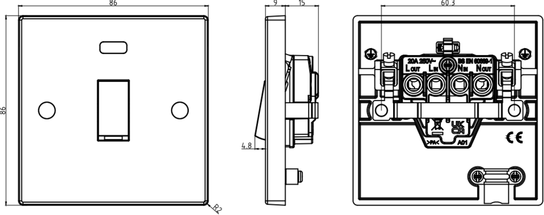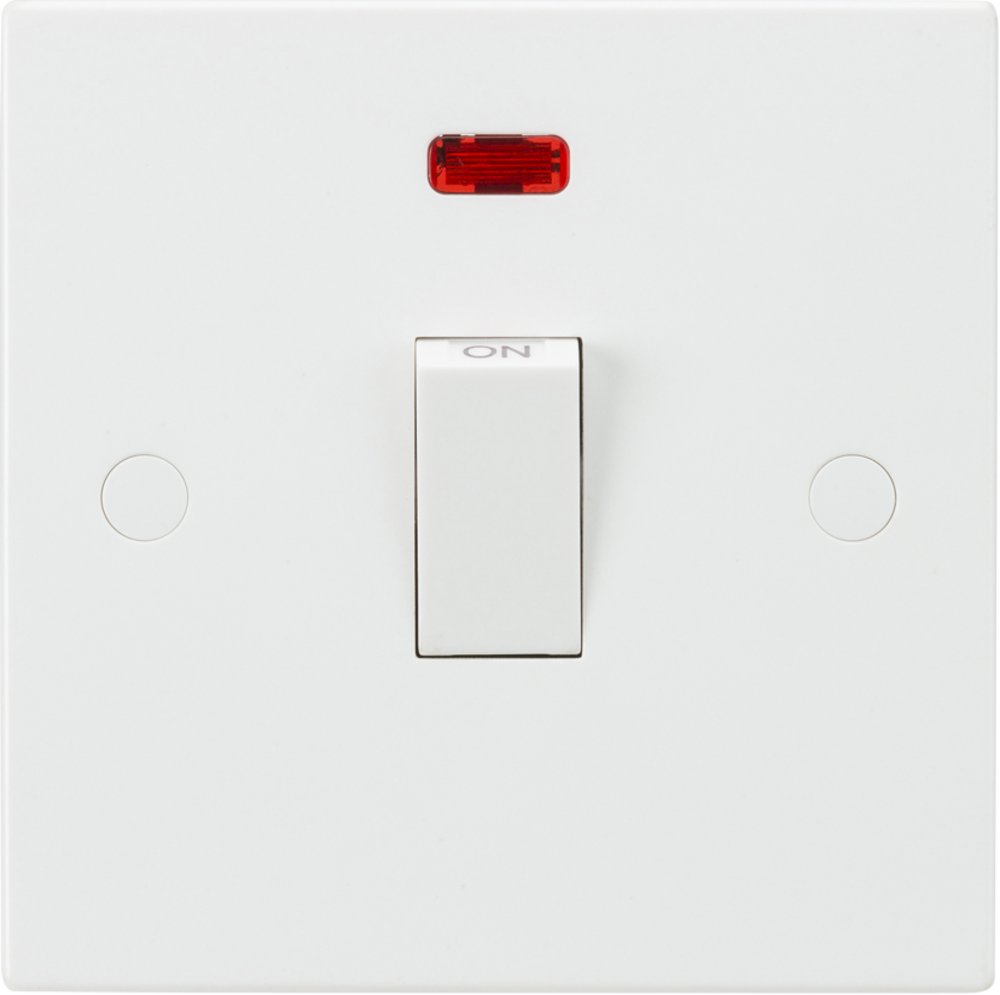 Knightsbridge: SN8341N, 20A Double Pole Switch with Neon Indicator, 9mm White Plate, Anti-Microbial, EN 60669-1