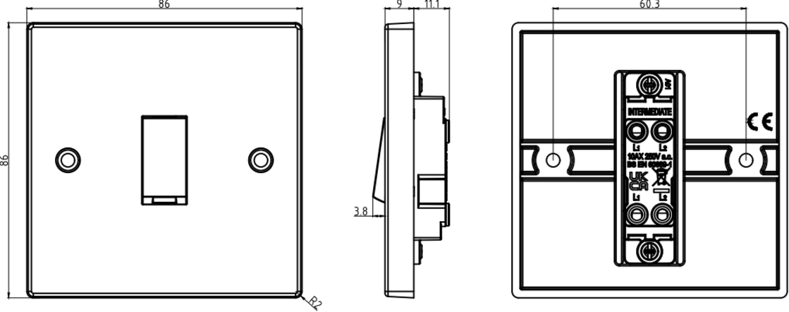 The Knightsbridge 10AX 1G Intermediate Switch is designed for all-purpose usage with a hard-wearing square edge 9mm plate that has anti-microbial properties.