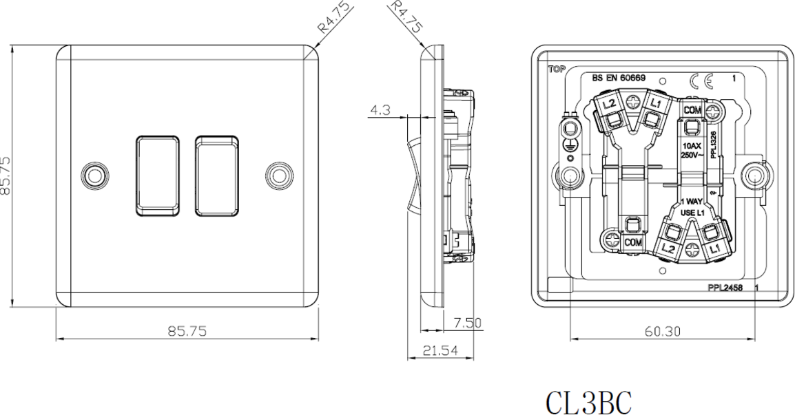 Knightsbridge: CL3MBB, 10AX 2G 2-Way Switch, Matt Black, Rounded Edge, IP20, 230V 50Hz, 304 Stainless Steel