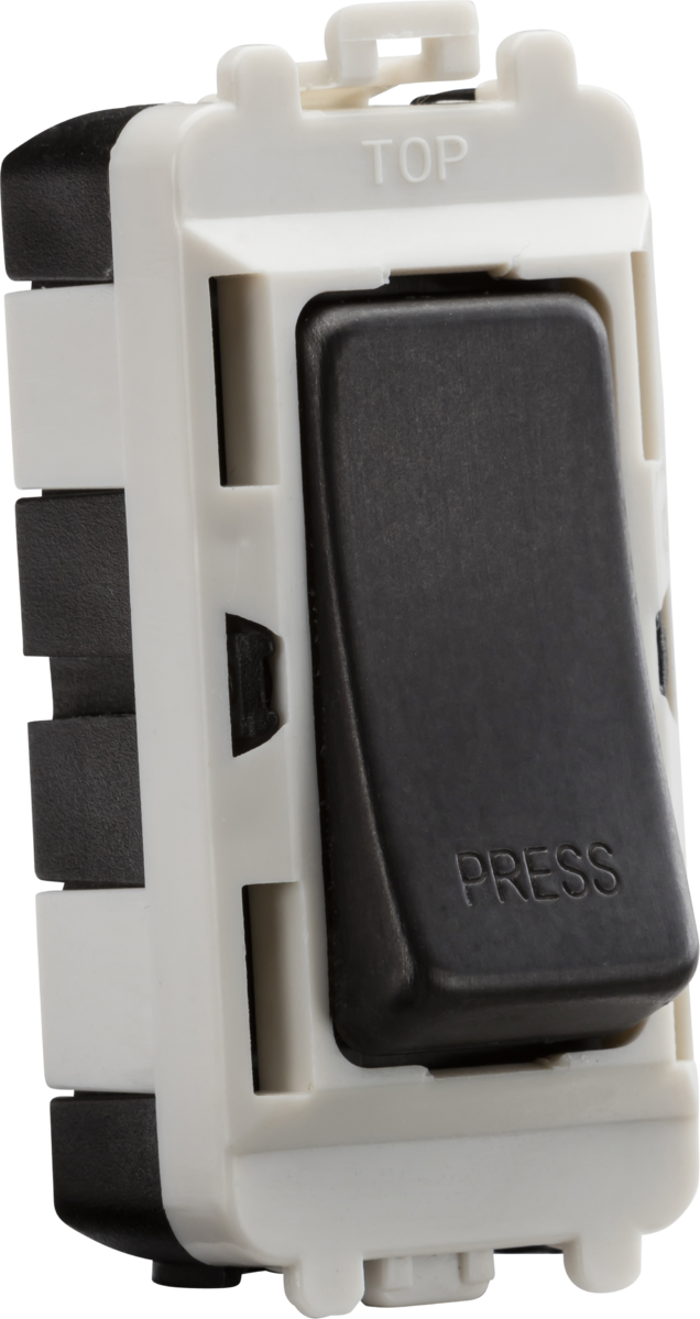 This 20AX 2 way retractive switch module, marked 'PRESS', features a sleek smoked bronze finish. It effortlessly clips into position from the front of the mounting frames (sold separately).