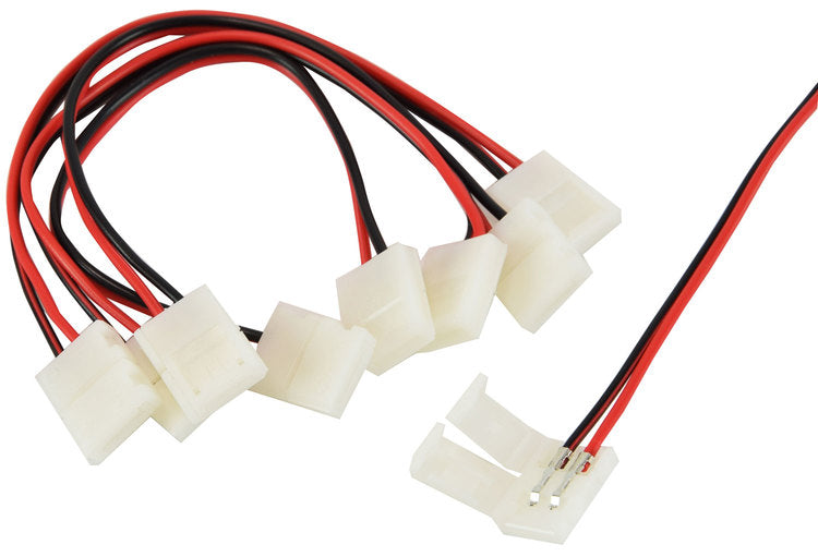 Packs of 5 flexible links comprising 150mm wire with a snap connector at each end for connecting lengths of LED tape to extend runs or negotiate corners. Snap connectors fit onto connection pads on the tape after paring back any silicone or waterproof coating to make an electrical connection without the need for solder. Where needed, these links can also be cut in half to provide bare wire connection to power supplies with screw terminals. A quick and mess-free solution for in-line connection in LED tape installations.