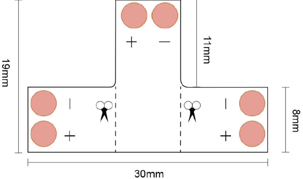 The 12V / 24V LED flex 3-way T-connector is ideal for use with single colour 8mm LED flex. Features include: