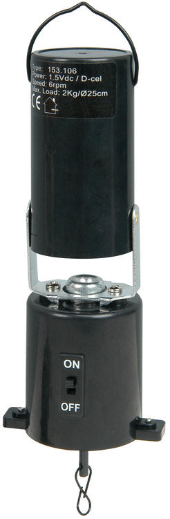 Motor for mirror balls up to 2kg in weight. Ideal for venues without wall socket outlets. Battery: 1.5V (1 x D) not supplied.